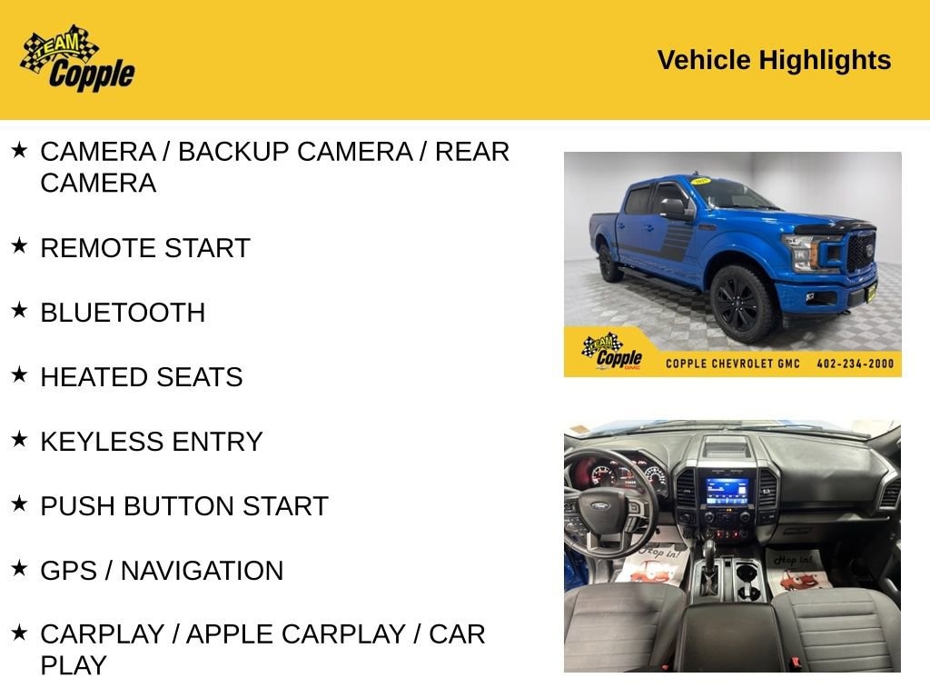 2019 Ford F-150 XLT 3.5L V6 EcoBoost 4WD 10-Speed AutomaticCAMERA / BACKUP CAMERA / REAR CAMERA, REMOTE START, BLUETOOTH, HEATED SEATS, KEYLESS ENTRY, PUSH BUTTON START, GPS / NAVIGATION, CARPLAY / APPLE CARPLAY / CAR PLAY, ANDROID / ANDROID AUTO, TOUCH SCREEN / TOUCHSCREEN, REAR SENSORS, RUNNING BOARDS, XM / SIRIUS / SIRIUSXM, TOW PACKAGE, 4X4 / AWD /4WD.THIS VEHICLE COMES WITH THE FOLLOWING FEATURES AND OPTIONS : ** Equipment Group 302A Luxury (10-Way Power Driver & Passenger Seats, 4.2 Productivity Screen in Instrument Cluster, Auto-Dimming Rear-View Mirror, Cloth 40/20/40 Front Seat, Fixed Backlight w/Privacy Glass, Heated Front Seats, Leather-Wrapped Steering Wheel, Power Glass Heated Sideview Mirrors, Power-Adjustable Pedals, Rear Under-Seat Storage, Rear Window Defroster, Remote Start System, and SiriusXM Radio), Max Trailer Tow Package (Class IV Trailer Hitch Receiver, Engine Oil Cooler, Extended Range 36 Gallon Fuel Tank, Integrated Trailer Brake Controller, Pro Trailer Backup Assist, and Upgraded Front Stabilizer Bar), XLT Chrome Appearance Package (2-Bar Style Grille w/Chrome 2 Minor Bars, Chrome Door & Tailgate Handles w/Body-Color Bezel, Chrome Step Bars, and Single-Tip Chrome Exhaust), XLT Power Equipment Group (LED Box Lighting and Power-Sliding Rear Window), XLT Special Edition Package (Black Running Boards, Body-Color Surround Grille w/Black Mesh Insert, Box Side Decal, Unique Bodyside & Hood Decals, and Wheels: 20 Unique Premium Tarnished Dark Painted), XLT Sport Appearance Package (2-Bar Style Grille w/2 Minor Bars Painted Dark, Accent-Color Step Bars, Body-Color Door & Tailgate Handles, Body-Color Front & Rear Bumpers, and Box Side Decals), 110V/400W Outlet, 4-Wheel Disc Brakes, 6 Speakers, 8-Way Power Driver Seat, ABS brakes, Air Conditioning, Alloy wheels, AM/FM radio, AppLink/Apple CarPlay and Android Auto, Auto High-beam Headlights, Black Platform Running Boards, Brake assist, Bumpers: chrome, Compass, Delay-off headlights, Driver door bin, Driver vanity mirror, Dual front impact airbags, Dual front side impact airbags, Electronic Stability Control, Emergency communication system: SYNC 3 911 Assist, Exterior Parking Camera Rear, Front anti-roll bar, Front Center Armrest w/Storage, Front fog lights, Front License Plate Bracket, Front wheel independent suspension, Fully automatic headlights, Illuminated entry, Low tire pressure warning, Navigation System, Occupant sensing airbag, Outside temperature display, Overhead airbag, Panic alarm, Passenger door bin, Passenger vanity mirror, Power door mirrors, Power steering, Power windows, Radio data system, Radio: AM/FM Stereo w/6 Speakers, Rear step bumper, Remote keyless entry, Reverse Sensing System, Security system, Speed control, Speed-sensing steering, Split folding rear seat, Steering wheel mounted audio controls, SYNC 3, Tachometer, Tailgate Step w/Tailgate Lift Assist, Telescoping steering wheel, Tilt steering wheel, Traction control, Unique Sport Cloth 40/Console/40 Front-Seats, Variably intermittent wipers, Voice-Activated Touchscreen Navigation, and Voltmeter.Visit us at www.copplecars.com!